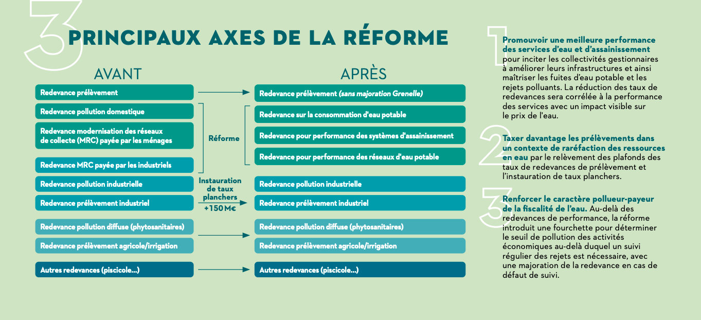 Ainsi, trois nouvelles redevances sont créées : une redevance sur la consommation d’eau potable, une redevance pour la performance des systèmes d’assainissement collectif et une redevance pour la performance des réseaux d’eau potable. Elles se substituent aux redevances existantes pour pollution de l’eau d'origine domestique et pour modernisation des réseaux de collecte.